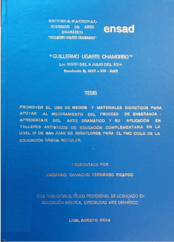 Promover el uso de medios y materiales didácticos para apoyar al mejoramiento del proceso de enseñanza aprendizaje del arte dramático y su aplicación en talleres artísticos de educación complementaria en la UGEL 01 de San Juan de Miraflores para el 7mo ciclo de la educación básica regular / Fernando Ricardo Magaraci Camacho