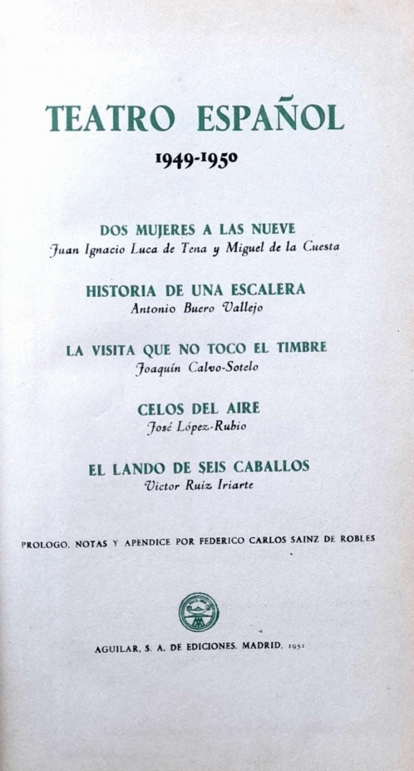 Teatro español 1949-1950 : Dos mujeres a las nueve. Historia de una escalera. La visita que no tocó el timbre. Celos del Aire. El landó de seis caballos / Federico Carlos Sainz de Robles , prologuista, notas y apéndice.