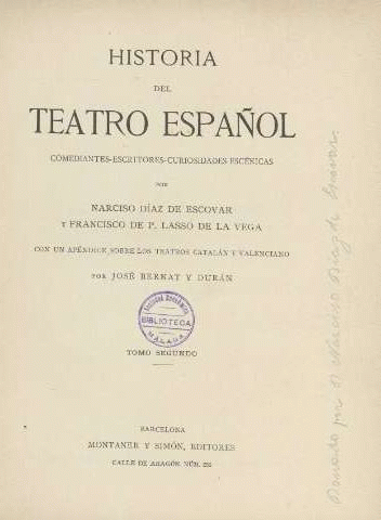 Historia del teatro español : comediantes escritores curiosidades escénicas con un apéndice sobre los teatros catalán y valenciano / Narciso Díaz de Escovar ; Francisco de P. Lasso de la Vega ; José Bernat y Durán.