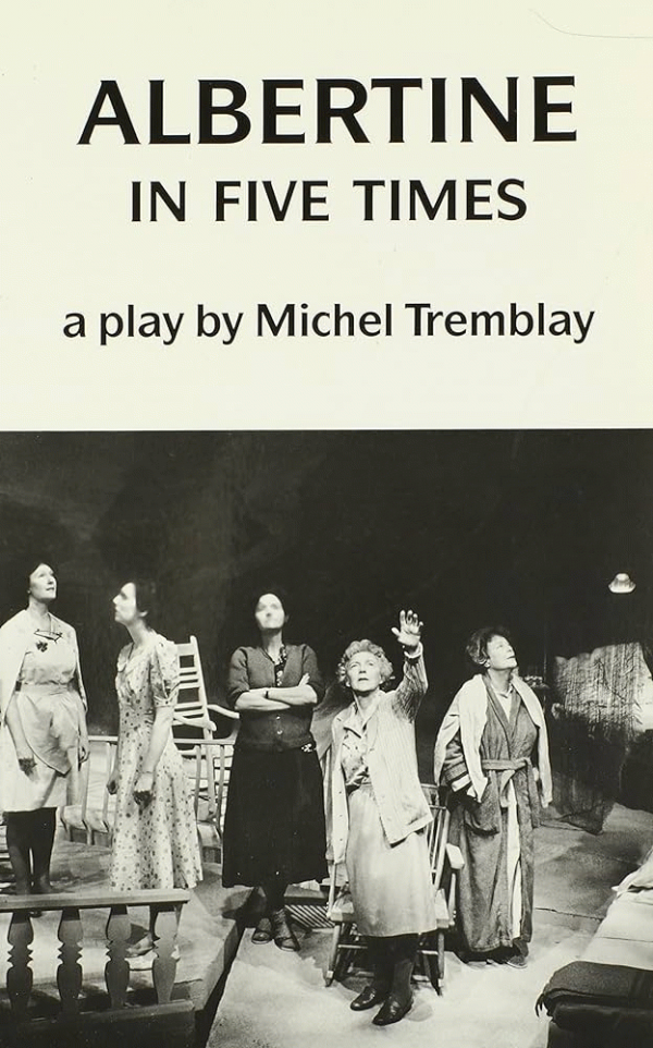 he play centres on Albertine, who appeared as a minor or supporting character in several of Tremblay's other works.[2] In the play, the 70-year-old Albertine interacts with her younger selves at the ages of 30, 40, 50 and 60, dramatizing her interior monologue as she reflects on her life after moving into a retirement home.[2] Apart from the five Albertines, the only other character who appears in the play is her sister Madeleine.
