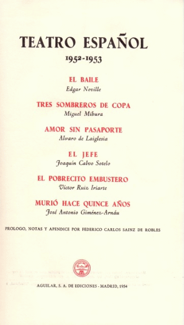 El baile - Edgar Neville -- Tres sombreros de copa - Miguel Mibura --- Amor sin pasaporte - Alvaro de Laiglesia -- El jefe - Joaquin Calvo Sotelo -- El pobrecito Embustero - Victor Ruiz Iriarte -- Murió hace quince años - José Antonio Giménez Arnáu