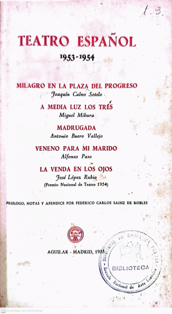 Milagro en la plaza del progreso - Joaquín Calvo Sotelo -- A media Luz dos tres - Miguel Mibura -- Madrugada -- Antonio Buero Vallejo -- Veneno para mi marido - Alfonso Paso -- La venda en los ojos - José López Rubio
