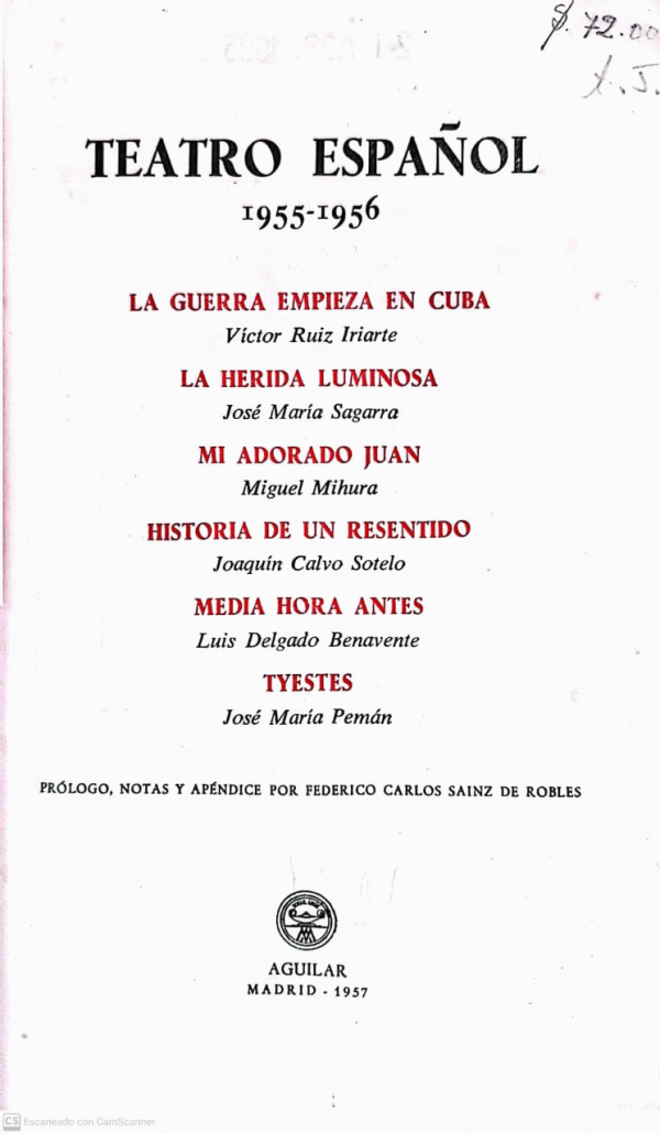 La guerra empieza en Cuba - Víctor Ruiz Iriarte -- La herida luminosa - José María Sagarra -- Mi adorado Juan - Miguel Mihuara -- Historia de un resentido - Joaquín Calvo Sotelo -- Media hora antes - Luis Delgado Benavente -- Tyestes - José María Pemán